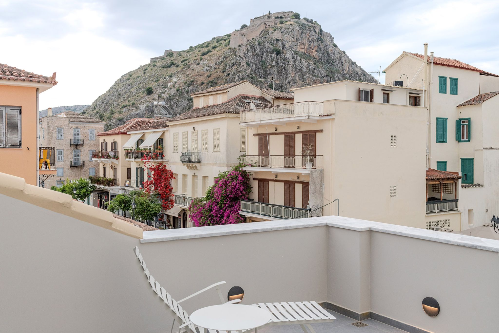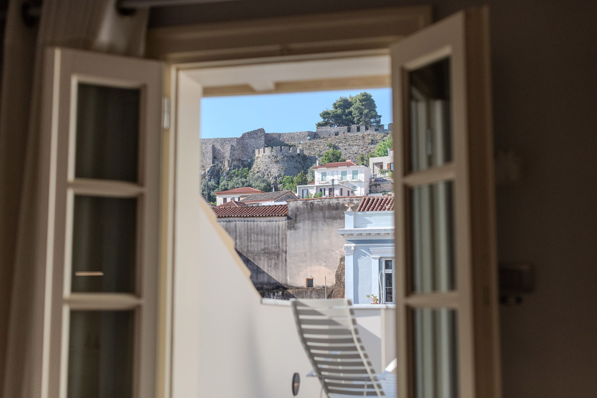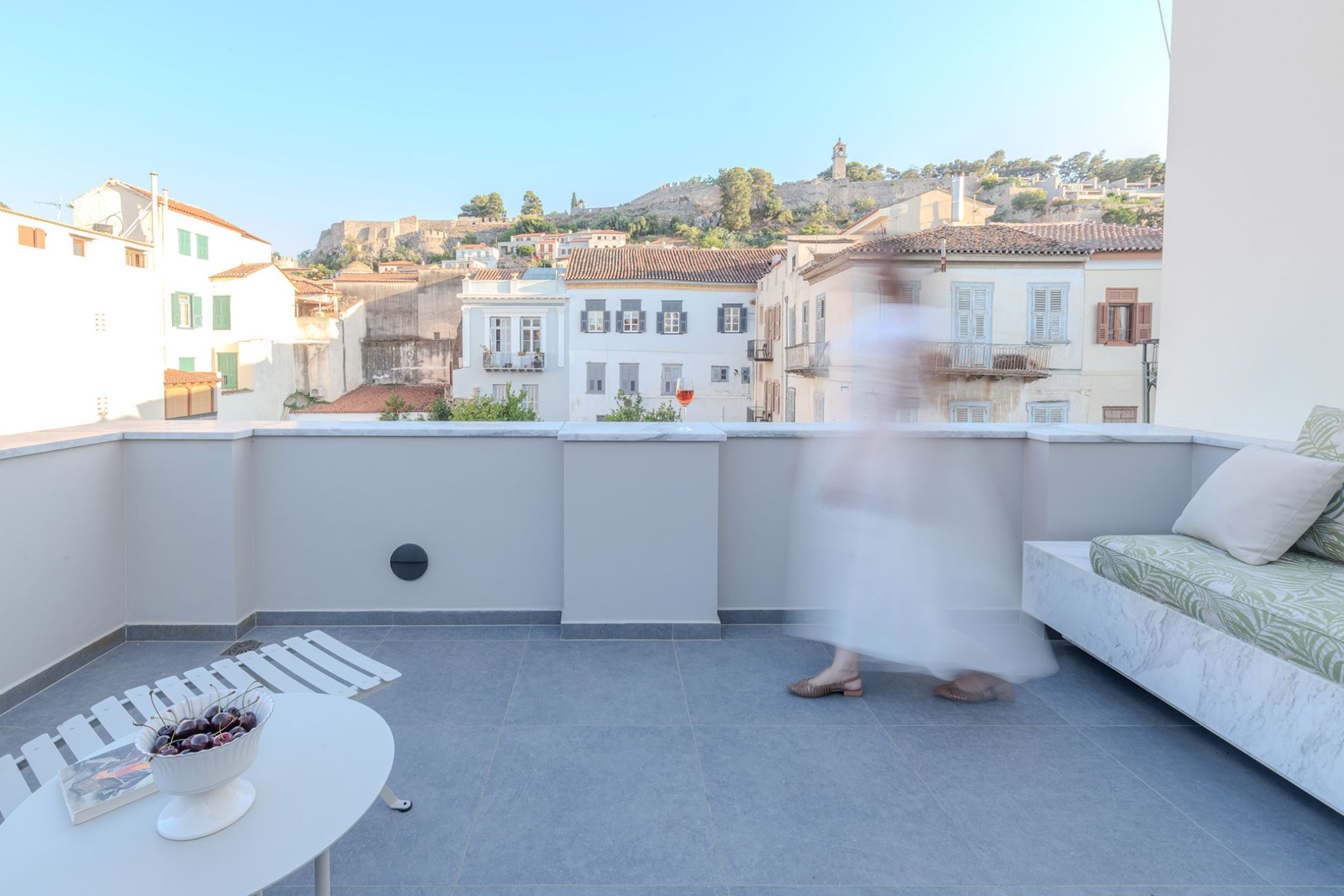 This elegant suite is 25 sq m. and can accommodate up to 3 people. The light gray tones of the room and the furniture combined with the wooden floor and the spacious private terrace overlooking the Palamidi Castle, the walls of Akronafplia and the historic pedestrian street of Amalias Avenue, surrounded by imposing neoclassical buildings, create a magical setting that combines luxury with the nobility of Nafplio. It includes a comfortable King Size bed, an armchair that converts into a single bed and a desk with a TV for moments of relaxation or work. It also has a comfortable luxurious bathroom with a shower equipped with all modern amenities.
