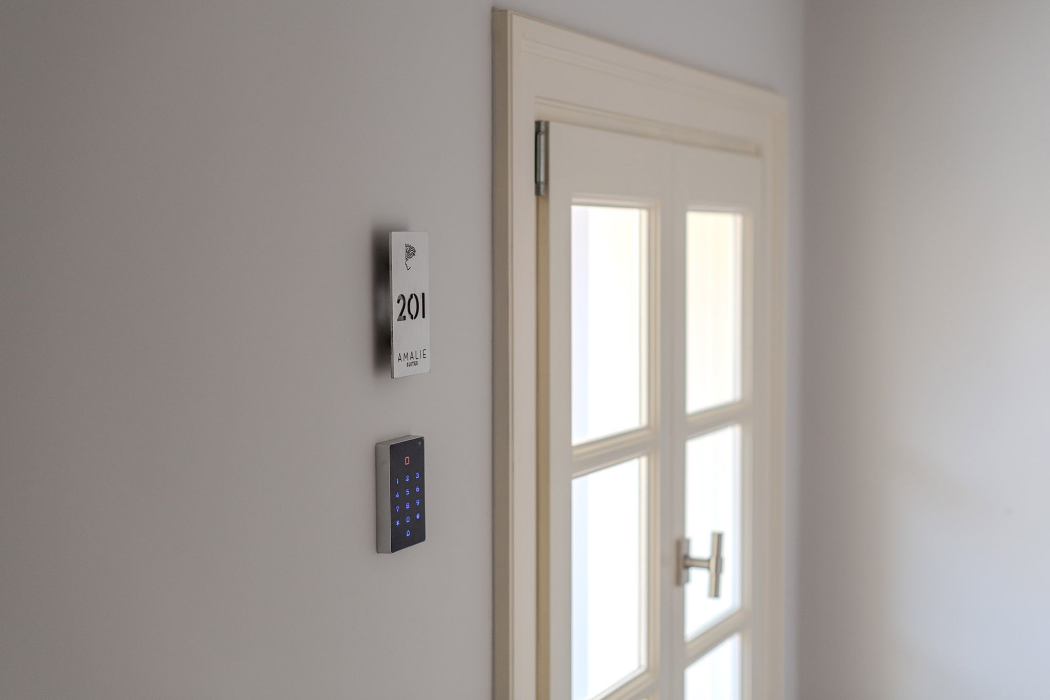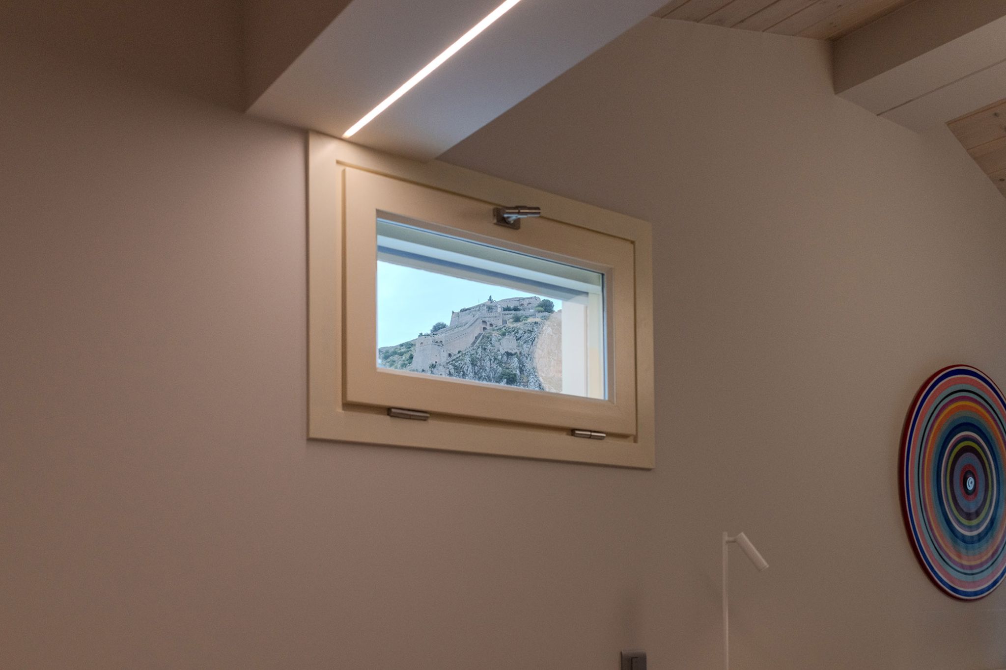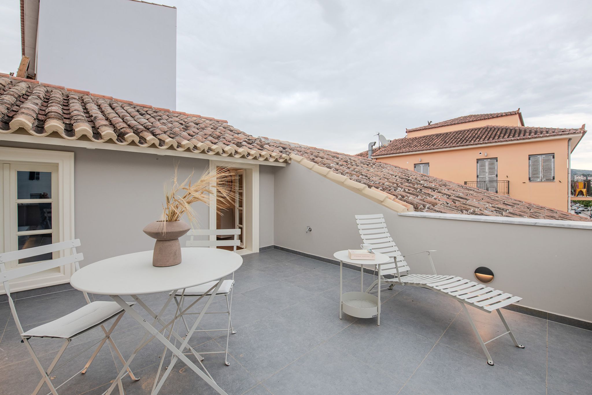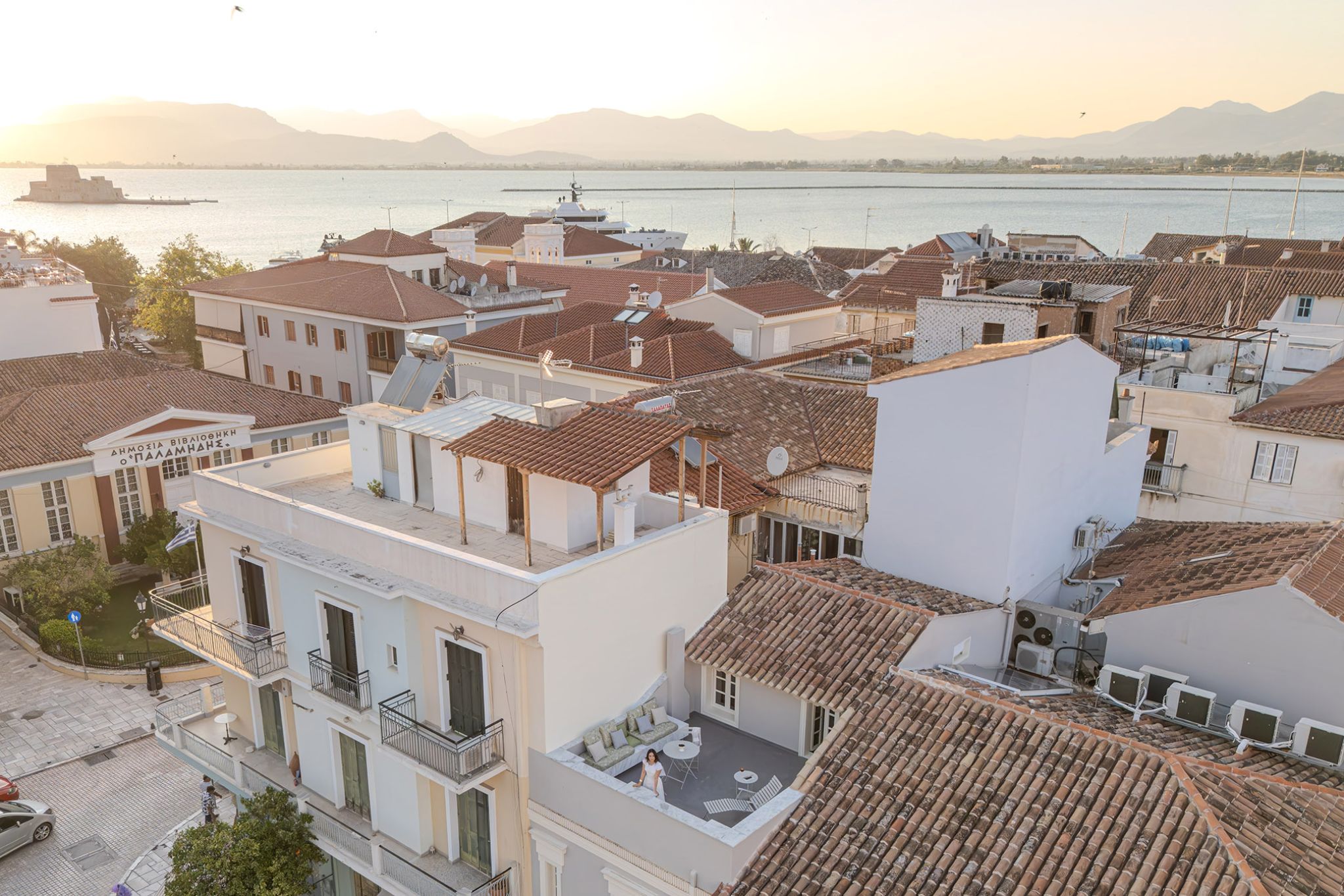 This elegant suite is 25 sq m. and can accommodate up to 3 people. The light gray tones of the room and the furniture combined with the wooden floor and the spacious private terrace overlooking the Palamidi Castle, the walls of Akronafplia and the historic pedestrian street of Amalias Avenue, surrounded by imposing neoclassical buildings, create a magical setting that combines luxury with the nobility of Nafplio. It includes a comfortable King Size bed, an armchair that converts into a single bed and a desk with a TV for moments of relaxation or work. It also has a comfortable luxurious bathroom with a shower equipped with all modern amenities.